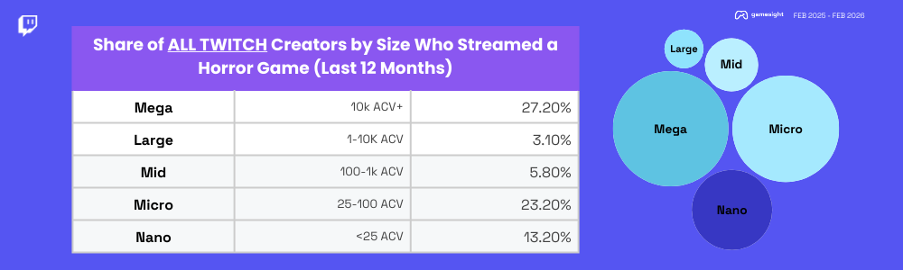 - Horror is a viewership magnet for bigger creators. Fans love watching big personalities get scared when live, 60% of "mega-sized" Twitch creators see a viewership boost from horror. Small and mid-sized creators are the genre's backbone who specialize and drive the bulk of viewer and stream hours.