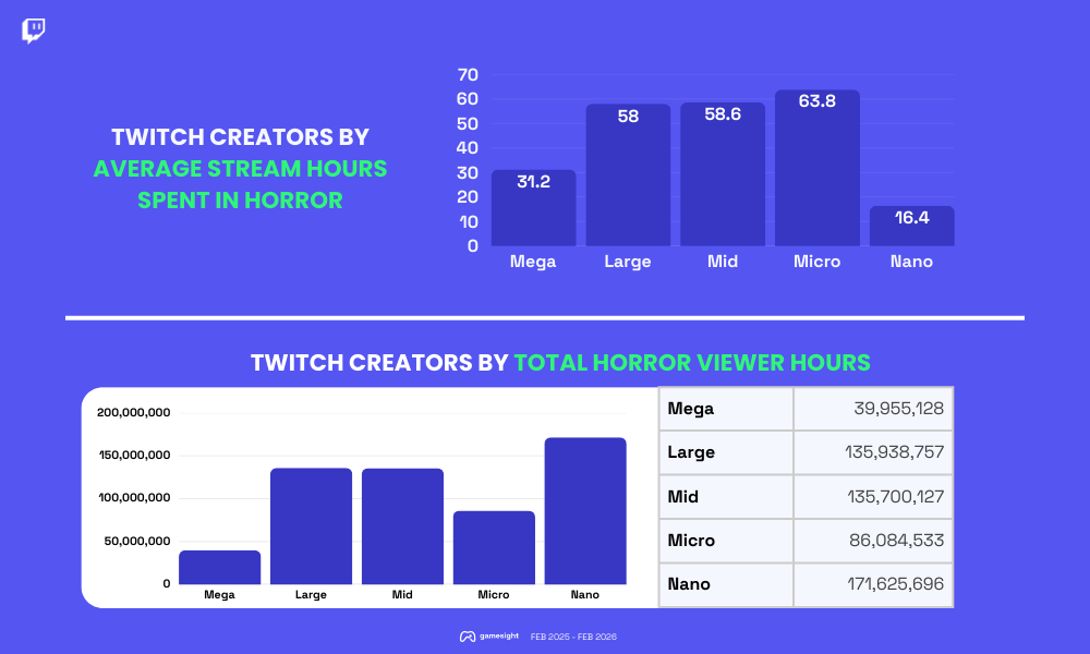 - Mid and large creators together drive more horror viewer hours (271M) than nano creators alone, thanks to their balance of volume and individual reach. On average, micro, mid, and large creators also dedicate the most average stream hours per creator to horror, making them the genre's workhorse tiers.