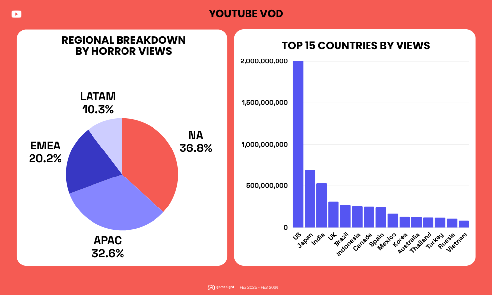 - Pakistan and India as “viral” horror markets on YouTube. Pakistan leads with the highest horror views index (4.7x) and 243M+ Shorts views, despite only 2.6% of its creators making horror content. India tells a similar story: low creator penetration, yet a top-five ranking for total horror viewer hours, suggesting a handful of creators are driving outsized, viral impact.
